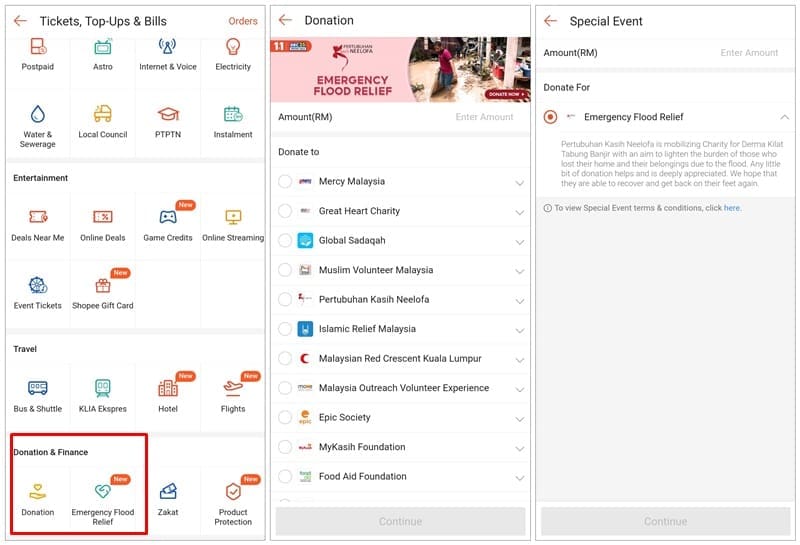 Shopee users can tap on the “Tickets, Top-Ups & Bills” tile in their app, and then scroll down to the “Donation & Finance” section to make donations to the flood relief effort. From there, you can either choose to contribute via “Donations” or “Emergency Flood Relief”.