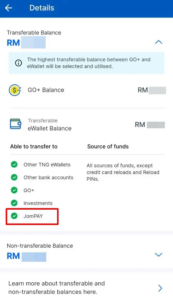 Previously, TNG eWallet noted that its transferable balance can be transferred to other TNG eWallets, other bank accounts or e-wallets, its TNG GO+ features, as well as investments (including GOinvest and more recently, ASNB) – with no explicit mention of JomPAY.