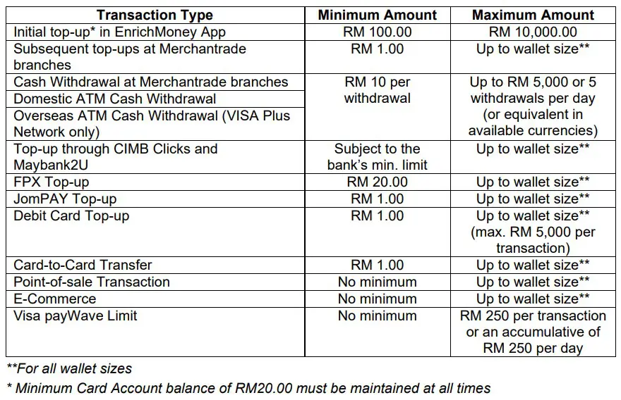 | Overseas retail transactions | Every RM25 = 1 EnrichMoney Point | – Dining & food deliver – Cinema, theatrical producers, ticketing agencies – Grocery – Commuter & other transports (including carwash and towing services) – Retail fashion & household – Departmental & retail stores – Hotels & travel agencies – Duty-free stores |