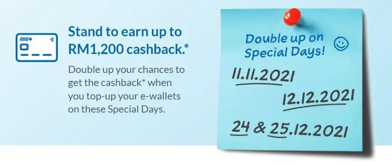 Following this update, eligible cardholders will still be able to earn up to two cashback rewards per month when they perform their e-wallet reloads on non-Special Days, but on top of that, they’ll also get another two additional chances to win cashback on every Special Day. RHB has listed four Special Days, namely 11 November, 12 December, as well as 24 and 25 December 2021.