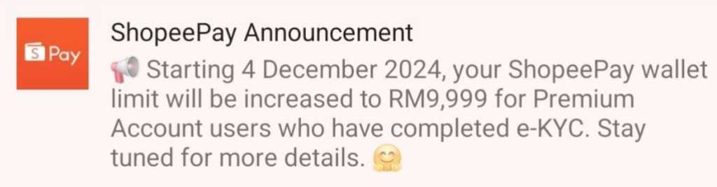 In an in-app notification sent to Premium Account users, Shopee revealed that starting 4 December, the ShopeePay wallet limit will be increased to RM9,999 for premium users who have completed the e-KYC (electronic Know Your Customer) verification process.