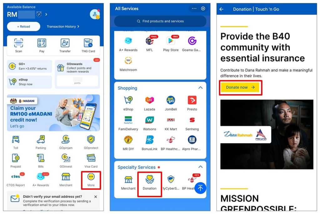 If you’re interested in contributing to this initiative, simply fire up your TNG eWallet app and tap on “More” to view all the services available on your TNG eWallet. Scroll all the way down to “Specialty Services” and tap on “Donation”. You can then click on “Donate Now” to make a direct donation (no minimum donation requirement).