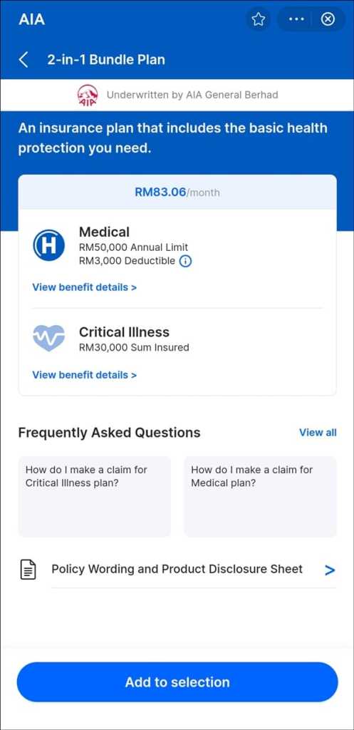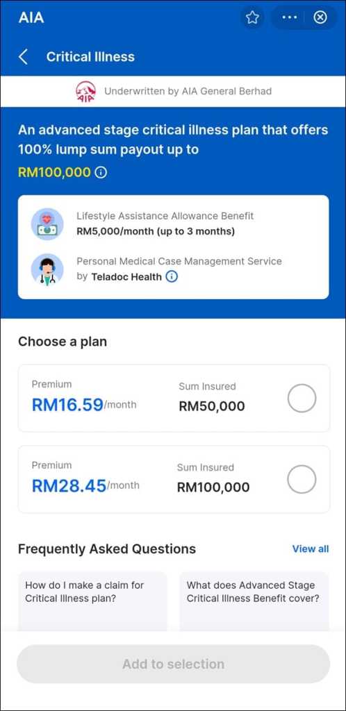| Critical illness insurance | – Advanced stage critical illness benefit of RM30,000 – Lifestyle assistance allowance benefit of RM3,000 per month (up to three months) – Personal medical case management service included |