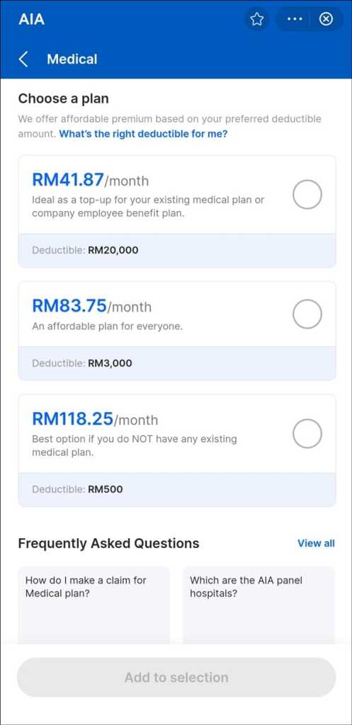 For those who are interested in purchasing medical insurance via Insure360 (Medical), you’ll be prompted to choose from three plans that offer up to RM100,000 annual coverage, with the need to pay an amount of deductible. To explain, an insurance deductible is the upfront amount that you must pay for your medical fees, before your insurance policy kicks in to pay for covered expenses.