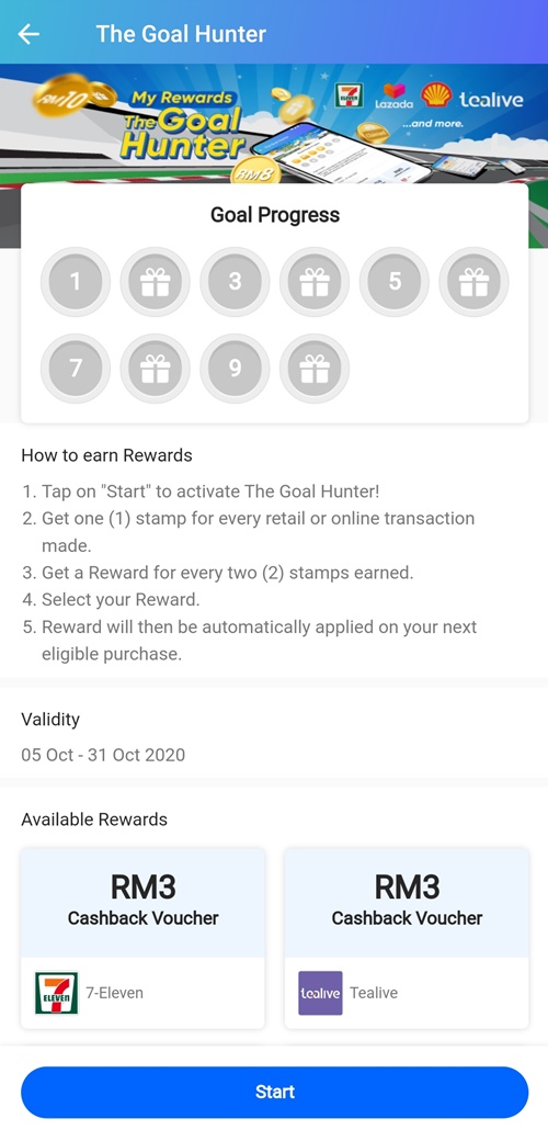 To join the Goal Hunter campaign, you are required to opt in by tapping on “Goals” under the “My Rewards” section in the main page of your TNG eWallet app; participation is not automatic. Once you’ve tapped on “Start”, you can begin collecting your stamps and redeeming your cashback rewards. Also, this promotion is limited to four million users only; once the quota has been filled, you can no longer join the campaign.