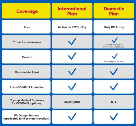 As for the premiums of these plans, the domestic plan will cost you RM3 per day, while the international plan starts from as low as RM10 per day – all subject to applicable government tax and stamp duty. If you’re purchasing for five or more individuals under the same order (maximum 10 persons per purchase), you can also tap into a group discount of 5%. There is also a rebate of up to 25% on the premiums for domestic plans and selected international destinations.