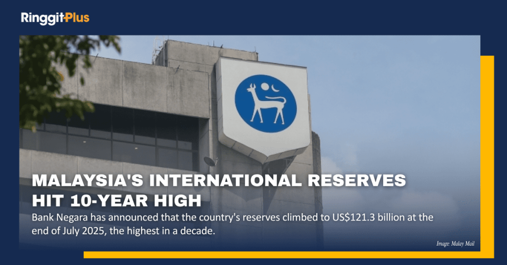 Malaysia’s international reserves climbed to a new 10-year high of US$121.3 billion (about RM546 billion) at the end of July 2025, according to Bank Negara Malaysia (BNM). This represents an increase of US$400 million (about RM1.8 billion) compared with the mid-July position.