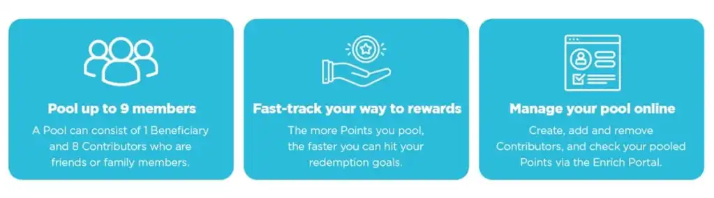 Each Pool has a validity of five years, ending on the last date of the fifth year (31 December), whereas the Points contributed to the Pool will follow the original expiry date based on the contributors’ earnings (and not the Pool’s expiry date). To clarify, all Enrich Points are valid for three years once it is earned and credited to a member’s account.