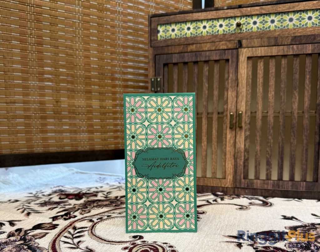 This one is giving pastel nostalgia! The shutter window motif wrapped in mint green instantly evokes images of kampung houses and breezy Aidilfitri mornings. Thoughtful, beautiful, and totally charming.
