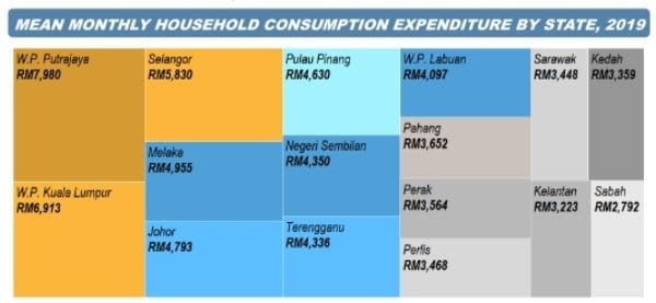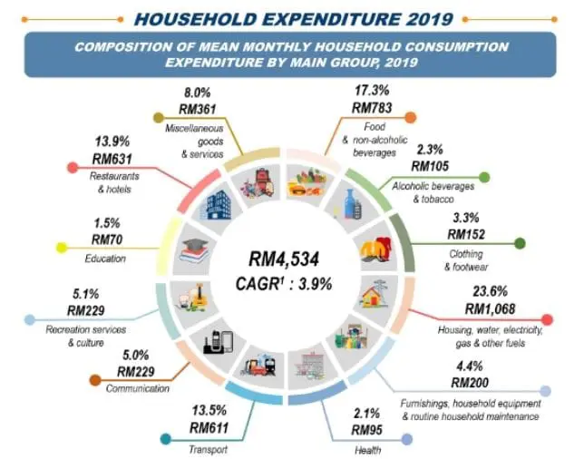 Malaysian households spent a mean of RM4,534 per month in 2019 compared to the monthly figure of RM4,033 in 2016, a survey by the Department of Statistics Malaysia (DOSM) found.