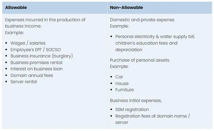 The deduction of your business expense will help to lower the gross income earned by your side business, and by extension, reduce the amount of tax that you need to pay. Here’s a table provided by LHDN that clarifies what falls under allowable business expenses that can be deducted, and what does not: