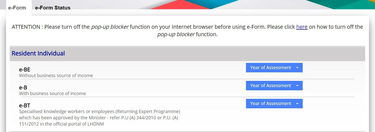 In Malaysia, the process for filing your income tax returns depends on the type of income you earn and subsequently, what type of form you are filing. Resident individuals who do not carry on a business will file the BE form, whereas resident individuals who do carry on a business will file the B form; meanwhile, non-resident individuals file the M form. You can find the full list of the different types of forms on the LHDN website.