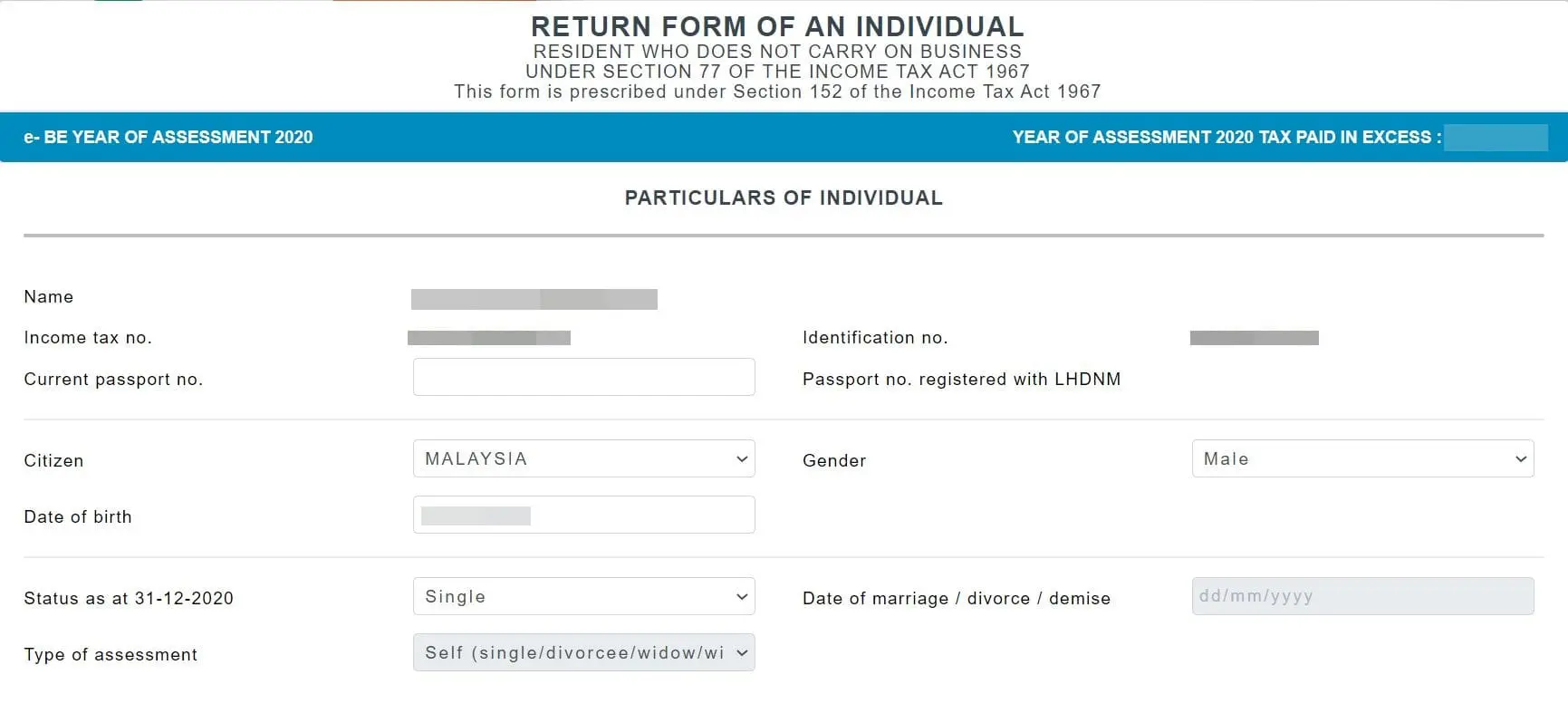 Choose the right form and select the year of assessment 2020 (remember, you are declaring your income earned for the year before). Next, we can get right down to the business of filling out your form; here’s a breakdown of what the BE form for residents earning income without a business will look like.
