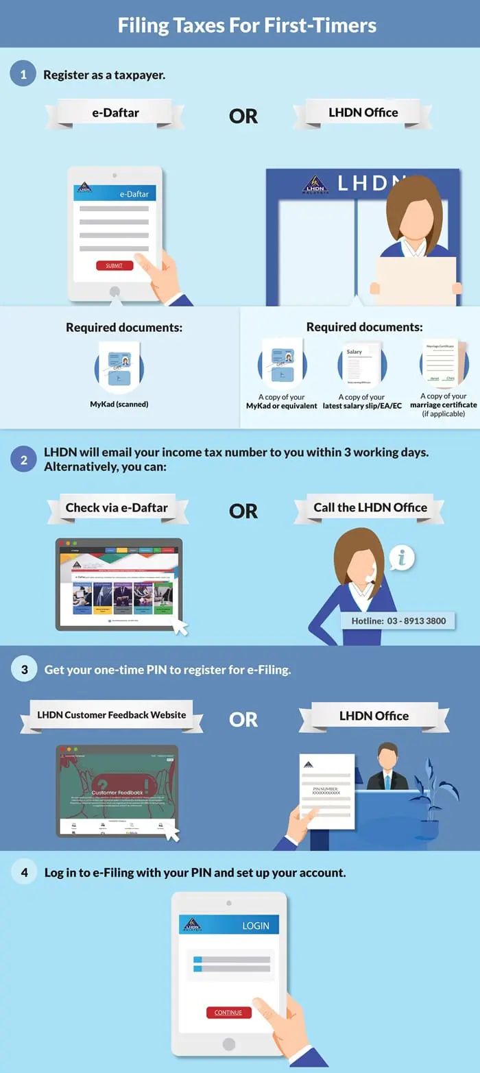 If this is your first time filing your taxes online, there are two things that you must have before you can start: your income tax number and PIN to register for e-Filing (the online service to submit your income tax return form (ITRF)). To get your income tax number, you’ll need to first register as a taxpayer on e-Daftar. After that, you can obtain your PIN online or by visiting a LHDN branch. Here’s a more detailed guide on how you should go about registering as a first-time taxpayer.