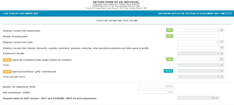 Once you’ve keyed in all your statutory income, the form will automatically total it up to show your aggregate income. The next step will be to move on to any tax deductions you may be eligible for so you can lessen your aggregate income. For example, you can make a tax deduction from your aggregate income if you have made a contribution of gifts or donations to the government or a government-approved charitable organisation. After making the deductions, you will be left with your total income.