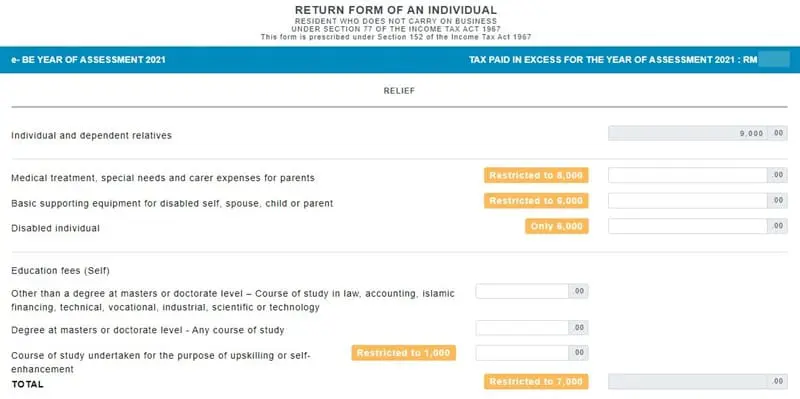 As you choose the right form, make sure that you also select the right year of assessment: YA 2021 (remember, you are declaring your income earned for the previous year). Next, we can get right down to the business of filling out your form; here’s a breakdown of what the BE form (for residents earning income without a business) will look like: