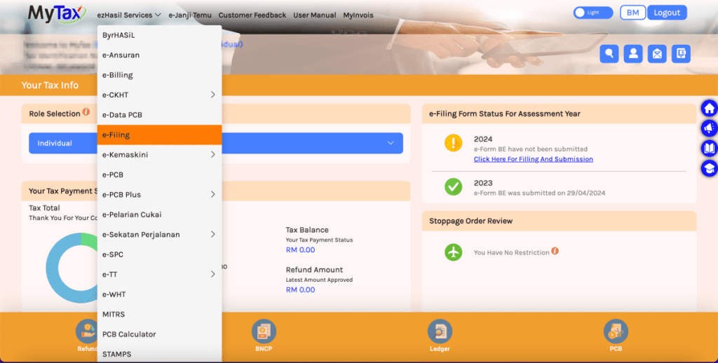One useful feature of MyTax and the e-Filing portal is the language toggle option, allowing you to switch between Bahasa Malaysia and English. If you’re more comfortable with one language over the other, make sure to adjust the settings—this will help make your tax filing process smoother and easier.