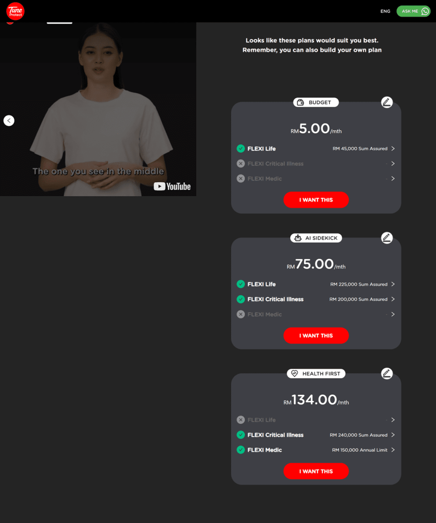 Designed especially for young individuals who are on a shoe-string budget, the premiums for FLEXIOne start from as low as RM5 per month. All customers can begin the purchase journey by providing some required information to FLEXIOne’s virtual assistant, Tracy – such as age and gender – who will then recommend three pre-packaged plans.