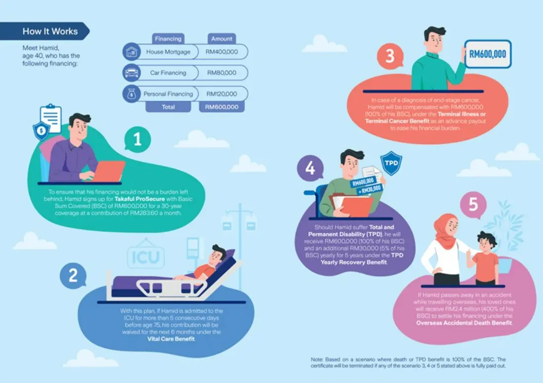 Aside from the coverage, the Takaful ProSecure plan also includes a terminal illness/terminal cancer (TITC) benefit, where you will be entitled to an advanced payout (100% of basic sum covered or total contribution made, whichever is higher) upon confirmation of your incurable condition. This feature is designed to assist individuals in managing their final journey of life, ensuring that both the policyholder and family members are financially supported during a challenging time.