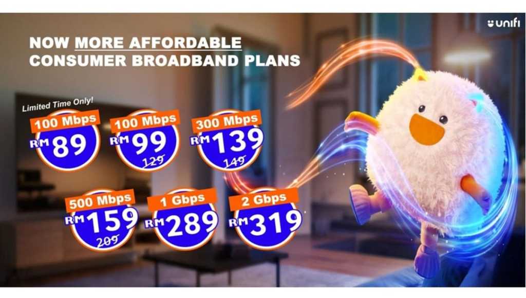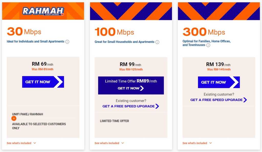| Home customers | 100Mbps 300Mbps 500Mbps 1Gbps 2Gbps | RM129 per month RM149 per month RM209 per month N/A N/A | RM99 per month RM139 per month RM159 per month RM289 per month RM319 per month |