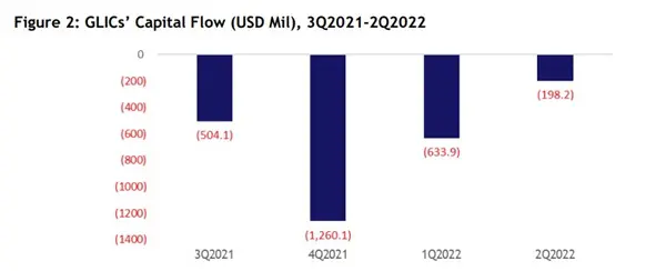 The portal also highlighted that cumulative capital outflows – defined as the total movement of assets out of a country – from nine government-linked investment companies (GLICs) in the domestic market had tapered off significantly from US$633.9 million in 1Q22 to US$198.2 million in 2Q22. This is as the EPF and Retirement Fund Inc (KWAP) have turned net buyers; the remaining seven GLICs are PNB, Amanahraya Investment Management Sdn Bhd, Khazanah Nasional Bhd, Lembaga Tabung Angkatan Tentera, Lembaga Tabung Haji, Pertubuhan Keselamatan Sosial, and PMB Investment Bhd.