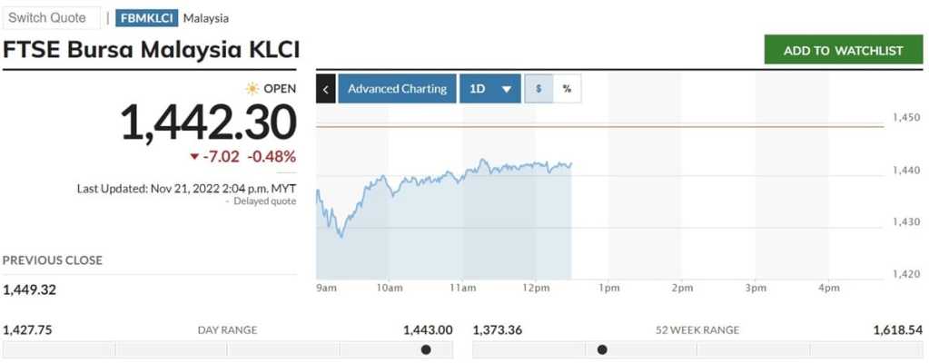 The early morning sell-off saw the benchmark FTSE Bursa Malaysia KLCI (FBM KLCI) fall 1.5% to a session low of 1,4277.75, from its closing 1,449.32 last Thursday (17 November 2022). It subsequently staged a small recovery, climbing back up to 1,442.30 as of the time of writing.