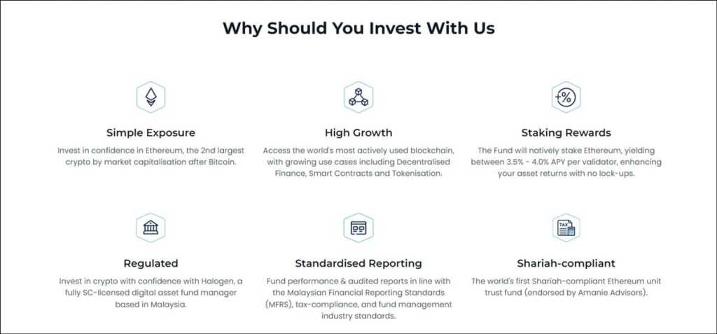 Halogen Capital also revealed that it is working with several partners for the Halogen Shariah Ethereum Fund, with its trustee being Universal Trustee (Malaysia) Berhad. Aside from that, the fund manager also appointed Amanie Advisors Sdn Bhd as its shariah advisor, and digital asset trust company BitGo as its custodian, which also provides staking as a service for its clients.