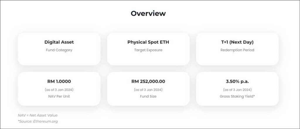 Aimed at investors with high risk tolerance and a long-term investment horizon, this growth fund will invest at least 70% of its net asset value (NAV) in Ethereum (ETH) traded on licensed digital asset exchanges that are approved by the Securities Commission Malaysia (SC). In addition, up to 70% of this investment may also be used for staking, the Ethereum network’s transaction validation process where you (referred to as a validator) deposit an amount of ETH to participate in the validation and securing of the ETH blockchain network, in return for some rewards distributed in ETH.
