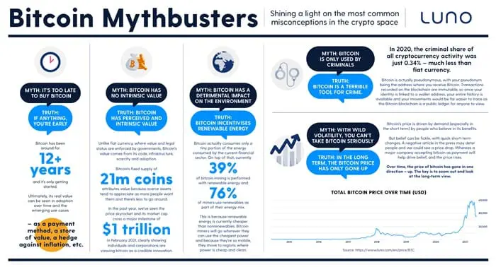“Currently, 39% of Bitcoin mining is performed with renewable energy and 76% of miners use renewables as part of their energy mix, far more than in other industries. This is because renewable energy is currently cheaper than non-renewable energy. Bitcoin miners will go wherever they can use the cheapest power, and because they are so mobile, they move to regions where power is cheap and clean,” Luno explained in a statement following a virtual media session where its country manager, Aaron Tang dispelled some of the most common myths regarding Bitcoin.