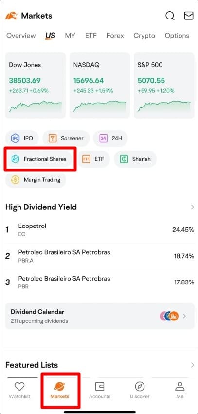 To find the full list of shares that are available for fractional trading on moomoo Malaysia, simply fire up the app and access the “Markets” tab via the bottom navigation bar. Make sure that you are on the “US Market” section, then tap on “Fractional Shares” to check out all the US shares that allow fractional trading.