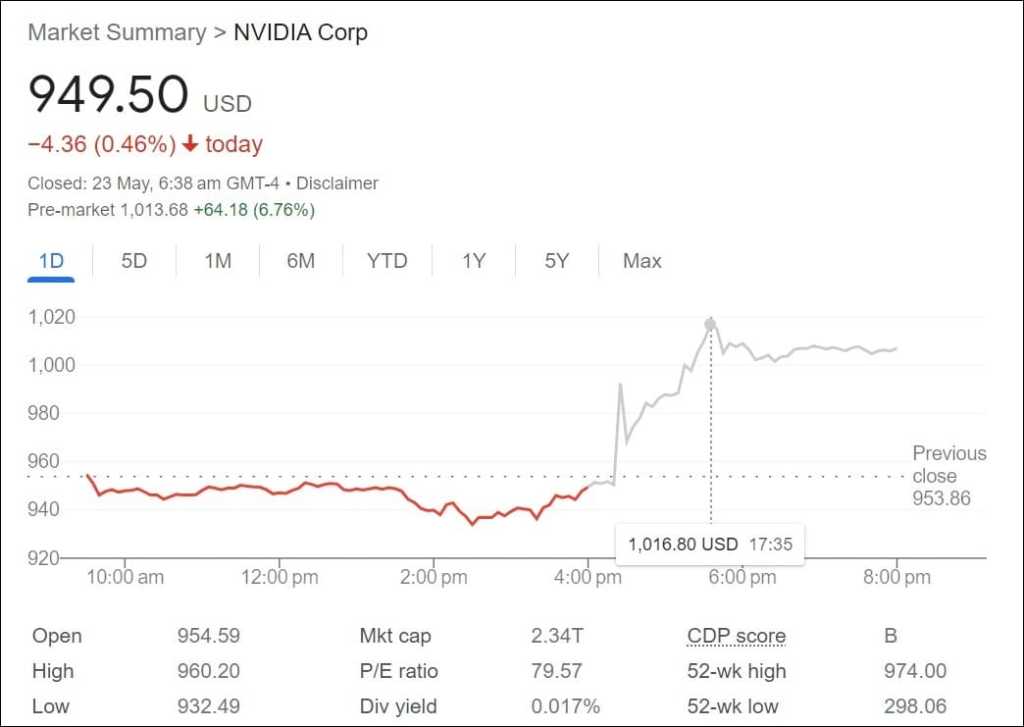 Specifically, NVIDIA’s share briefly rose up to a high of US$1,016.80 after the company announced its latest earnings for the first quarter of 2024 (ended 28 April 2024). The price then dipped slightly, but still remained above the US$1,000 mark at US$1,007.00 (as of the time of writing).