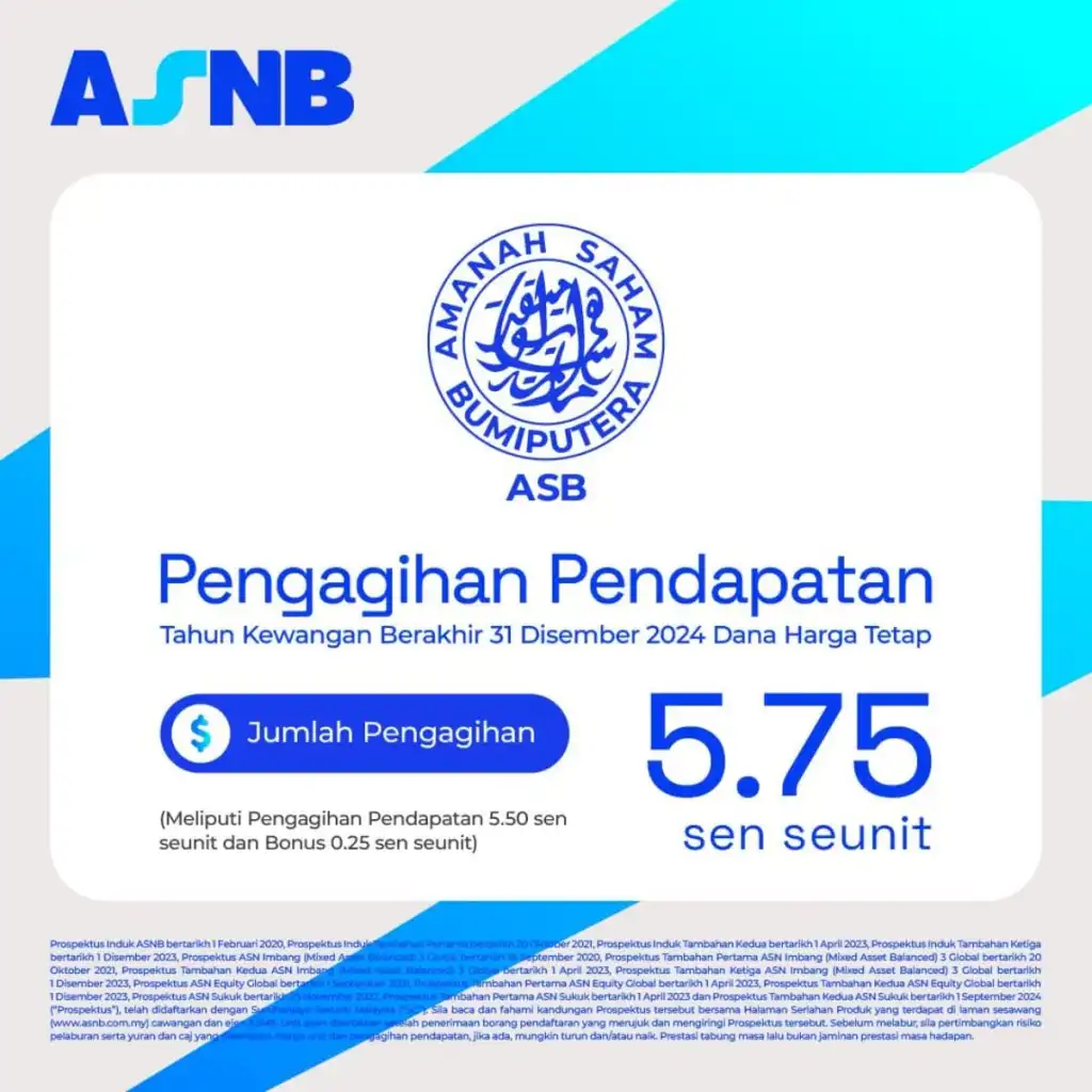 Permodalan Nasional Bhd (PNB) has announced a combined dividend and bonus distribution of 5.75 sen per unit for its largest unit trust fund, Amanah Saham Bumiputera (ASB), for 2024. This comprises a 5.5 sen dividend and a 0.25 sen bonus.