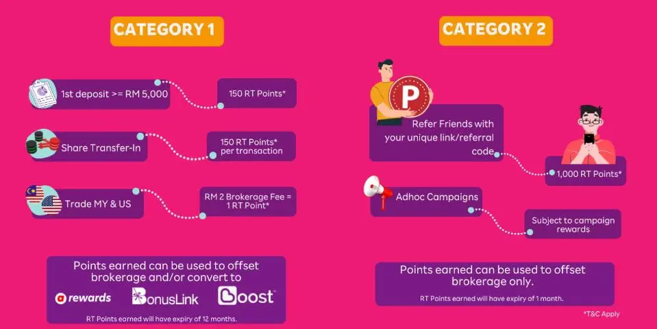 | RT Points earned | – 1st deposit of RM5,000 or more (150 RT Points) – Share transfer (150 RT Points per transaction) – Trade in Bursa Malaysia and the US market (1 RT Point for every RM2 brokerage fee spent) | – Refer friends using referral code (1,000 RT Points) – Adhoc campaigns/Webinars (amount of RT points awarded subject to campaign rewards) |