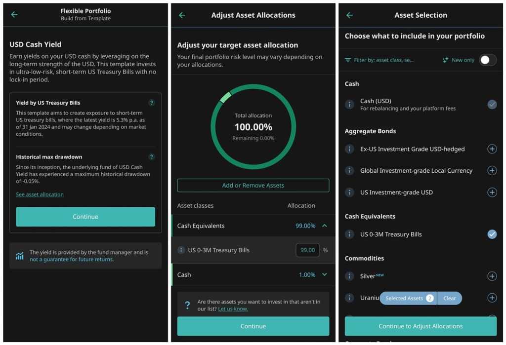 Those who do decide to invest in the USD Cash Yield Portfolio will start with a “template” portfolio, with 99% exposure to short-term US Treasuries. From there, they are free to customise their portfolio by adding or removing from more than 55 asset classes available, since the USD Cash Yield Portfolio is provided as an offering under Flexible Portfolios. You’re also able to adjust the weightage of each asset class according to your preference.