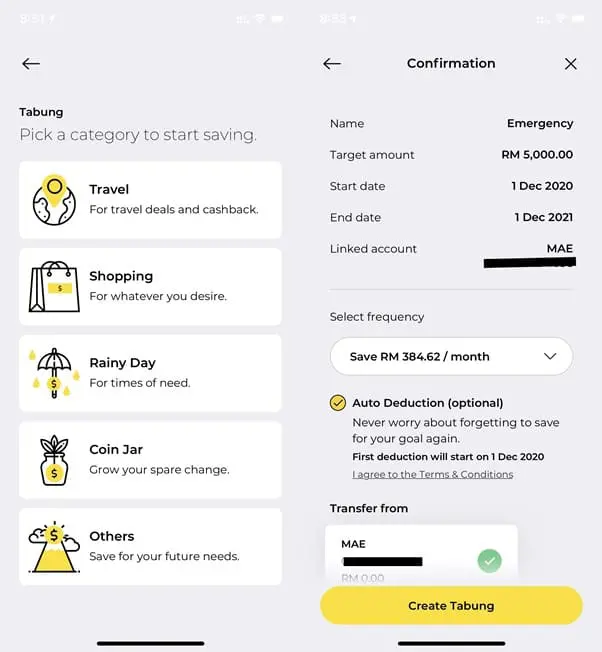 The Spare Change feature rounds up your expenses and transfers the “spare change” into your Tabung. For example, if your new t-shirt is RM19.50, then the amount to be paid will be rounded up to RM20 with the extra RM0.50 automatically transferred into your Tabung.