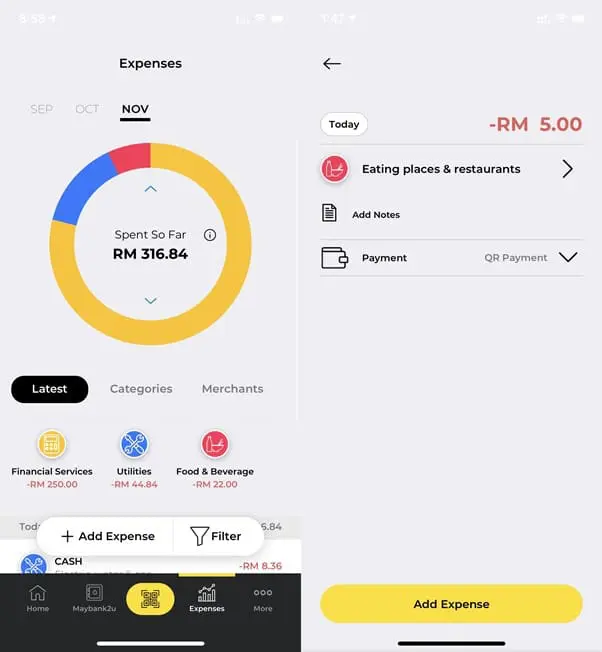 MAE by Maybank2u also comes with a tool to help you manage your spending called Expenses which provides you with a simple and comprehensive view of all your spending through your Maybank accounts, cards, and Scan & Pay (formerly known as Maybank QRPay) transactions.