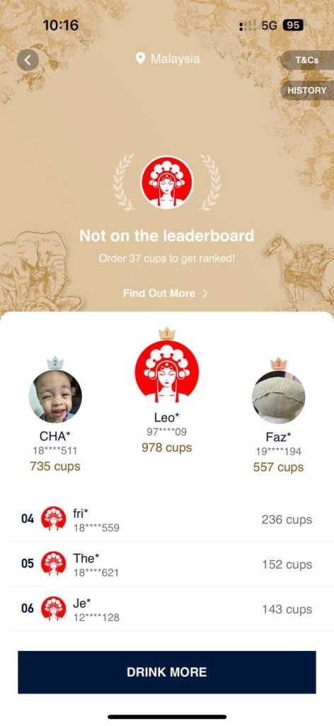 The story unfolded during CHAGEE’s Cup Challenge, which ran from 18 June to 18 July. The rules were simple. The person who bought the most drinks through the CHAGEE app during the campaign would win the grand prize. Leo did not just win. He completely dominated the leaderboard.