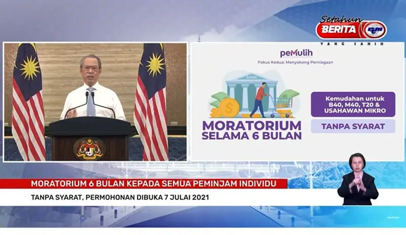 On 28 June 2021, Prime Minister Tan Sri Muhyiddin Yassin announced that a second six-month loan moratorium will be made available to all individual borrowers (B40, M40, or T20) and microentrepreneurs under the latest PEMULIH stimulus package. Running from July 2021 onwards, it is intended to offer some relief to Malaysians who are struggling financially following the implementation of a prolonged lockdown period to combat the spread of the Covid-19 pandemic.