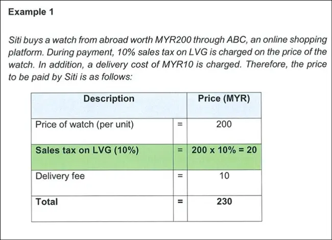 The department had also published a guide (dated 3 November 2023) and FAQ (dated 6 November 2023) on the LVG sales tax to provide further guidance for the public. Among other things, these documents clarified that the tax will be charged solely on the sale value of each LVG purchased – not including any tax, duty fees, or other charges (such as transportation, insurance, or other costs). Here’s a scenario shared by RMCD in its guide, where it showcased how the LVG tax will be applied: