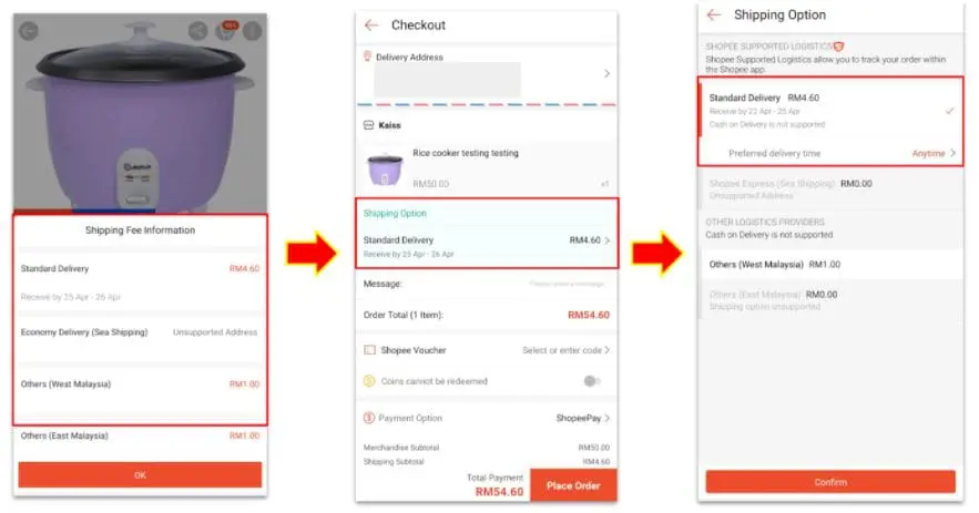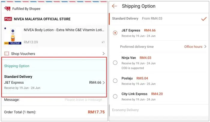 At present, users who buy from Shopee are given the flexibility to select their preferred courier service provider when they arrive at the checkout page. Courier options that are available include J&T Express, Ninja Van, and Poslaju; customers can compare the prices charged by each provider and their expected delivery period before deciding.