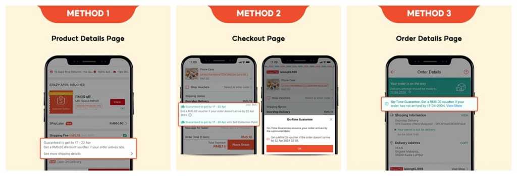 The On-Time Guarantee is essentially a policy guaranteeing that buyers will receive their orders within the estimated delivery period, which is displayed on the product details page, checkout page, or the order details page. If the delivery is late, then you’ll be entitled to claim a compensation voucher.