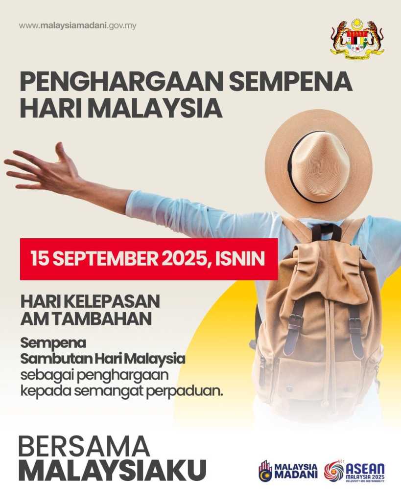 In conjunction with Malaysia Day celebrations, Monday, 15 September 2025, has been declared a one-off additional public holiday.