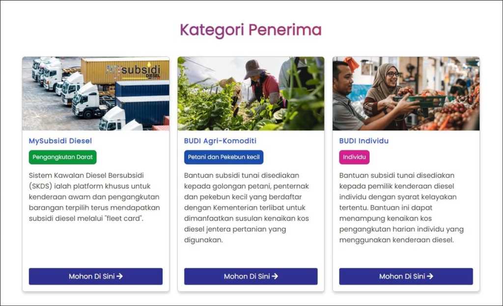 | – Malaysian citizen with annual individual or joint income of RM100,000 and below – Owns diesel-based personal vehicles as registered with the JPJ – Vehicles owned are not luxury vehicles under 10 years of age – Vehicles must have an active road tax * Applications will be cross-referenced with data from the Inland Revenue Board (LHDN) to exclude luxury vehicles that are less than 10 years old, and earners in T20 category | – Registered as a farmer or smallholder with the relevant agencies and ministries* – Must be an active agriculture or commodity smallholder, defined as generating an annual turnover of between RM50,000 and RM300,000 * Ministry of Agriculture & Food Security (KPKM) or Ministry of Plantation & Commodities (KPK) |