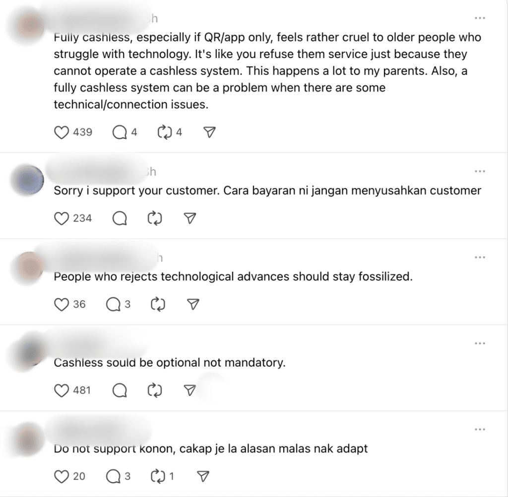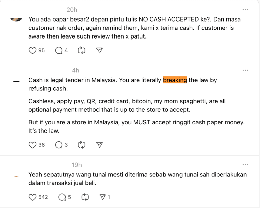 Others, however, felt that a cashless-only approach lacked inclusivity. Several pointed out that cash remains a legal form of payment in Malaysia, and businesses should still accept it. One user noted, “You’re literally breaking the law by refusing cash,” while another added that cafes should clearly state their payment policies at the entrance and during ordering.