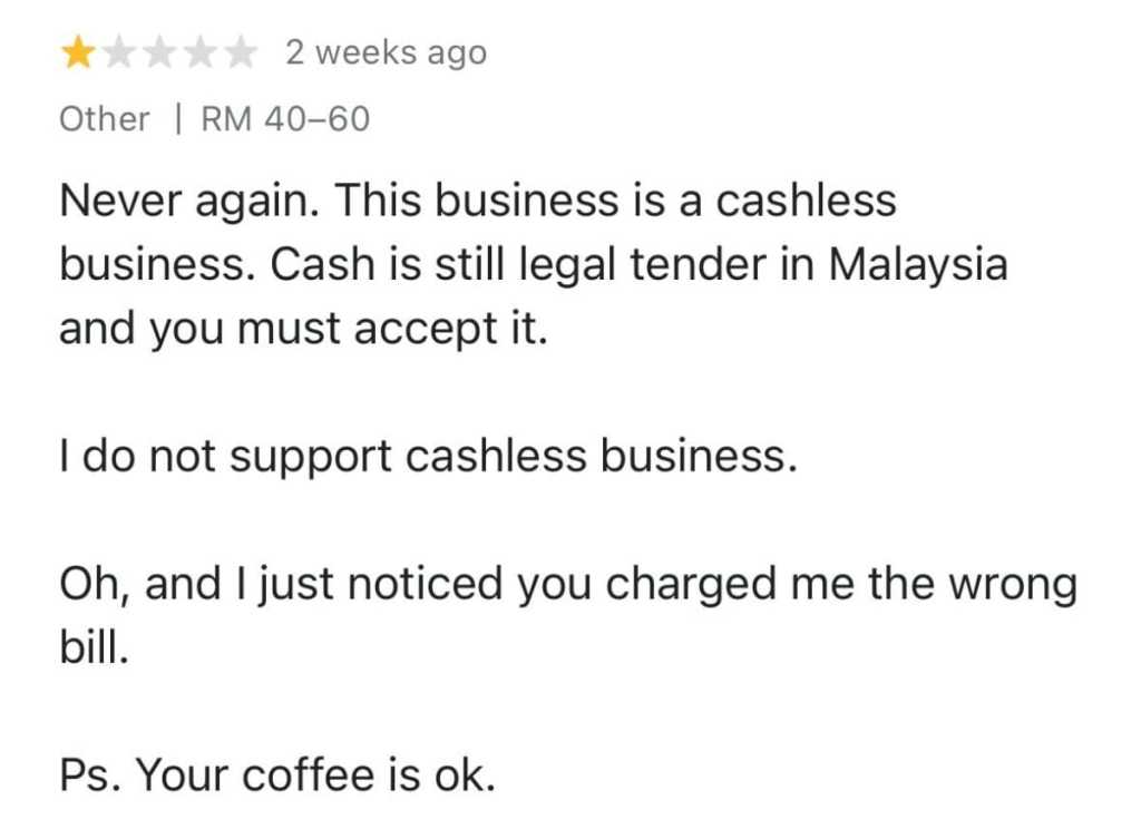 A cafe in Kuala Lumpur recently received a one-star Google review from a customer who criticised its cashless-only payment policy. The reviewer claimed they were unable to pay with cash, arguing that this contradicted the fact that cash remains legal tender in Malaysia. The review stated, “Cash is still a legal tender in Malaysia and you must accept it… Never again. This business is a cashless business.”