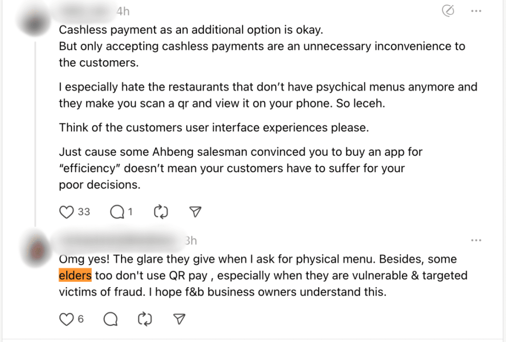 Several users raised concerns about customer accessibility, especially for the elderly or those unfamiliar with mobile banking. One commenter shared, “Some elders don’t use e-wallets and are often victims of fraud. Business owners need to understand this.” Others recounted situations where their mobile banking apps crashed, their phones died, or internet connectivity was unavailable. One user asked, “What if the bank system is down? Are we supposed to write our order in a notebook?” Another added, “Even roadside stalls accept all types of payment. Why can’t you?”