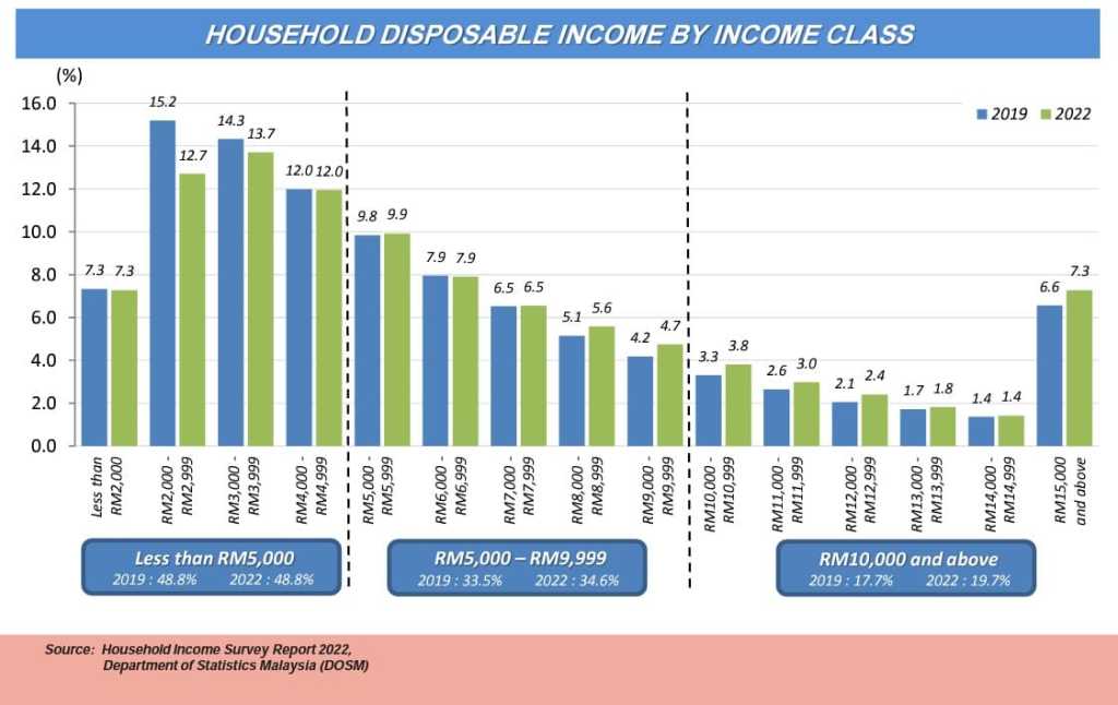 Meanwhile, the median household income in the country is revealed to have reached RM6,338 in 2022, with a moderate annual growth rate of 2.5%. This is in comparison to RM5,873, which was recorded back in 2019.