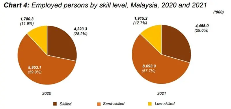In terms of the occupation category, Datuk Seri Dr Mohd Uzir Mahidin noted that the semi-skilled category recorded the highest number of employed individuals, accounting for 57.7% or 8.7 million of the total employed individuals in 2021. This was followed by the skilled category (29.6% or 4.5 million individuals) and the low-skilled category (12.7% or 1.9 million individuals).
