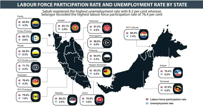 With regard to Malaysia’s unemployment rate, the chief statistician said that the rate in 2021 stood at 4.6% – an increase of 0.1% from the previous year. This translates to 733,000 unemployed individuals recorded in 2021, compared to 711,000 a year before. Among the states, Sabah recorded the highest unemployment rate at 8.2%, followed by Wilayah Persekutuan Labuan (7.4%) and Perak (5.3%). On the other hand, Putrajaya (1.6%), Melaka (2%) and Pahang (3.3%) registered some of the lowest unemployment rates in 2021.