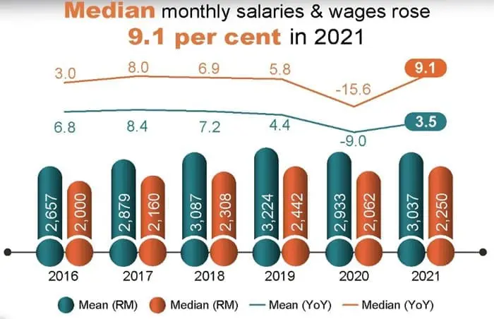 Similarly, the median monthly salaries and wages also recorded an increase of 9.1%, from RM2,062 in 2020 to RM2,250 in 2021. “In 2021, it was found that the median monthly salaries and wages received by male workers was RM2,315 and female workers RM2,145 – an increase of 10.6% and 6.2% respectively compared to 2020,” DOSM shared.